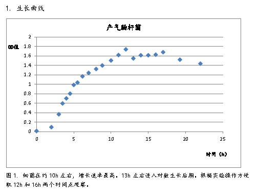 1、 將產(chǎn)氣腸桿菌菌種在5ml NA液體培養(yǎng)基中活化,活化的菌種接種于100ml NA液體培養(yǎng)基中,37℃搖床中培養(yǎng),接種后立即取0.1ml測量OD值,后連續(xù)22h取菌液測其OD值,并繪制實(shí)驗(yàn)菌株的生長曲線。