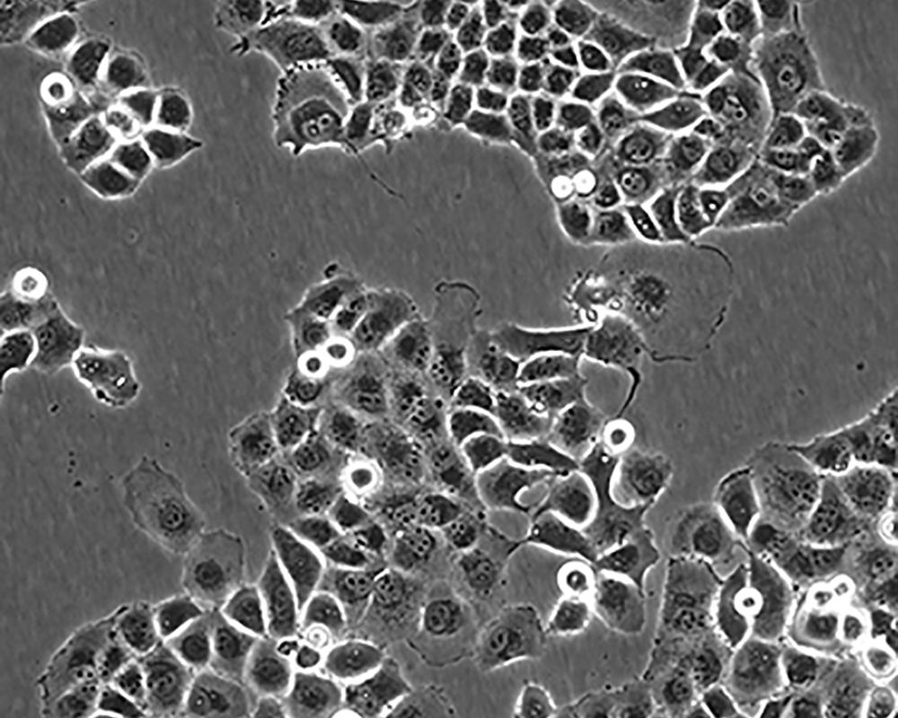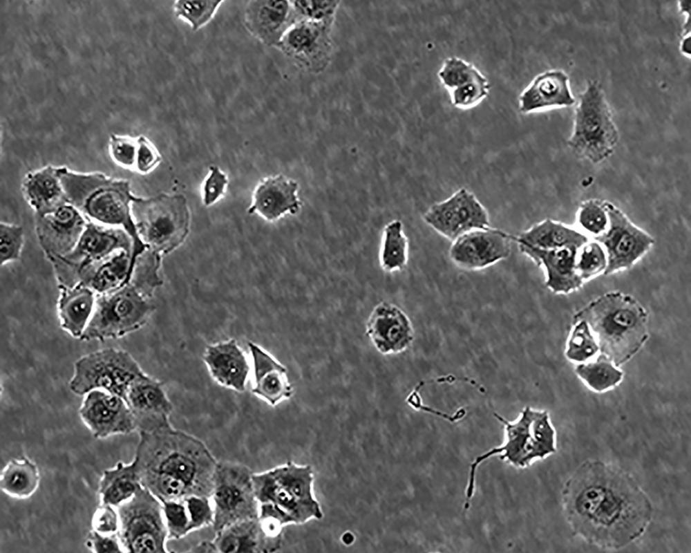 這株人胰腺癌細胞株源自于胰腺癌導管細胞,其倍增時間為52小時。染色體研究表明,該細胞染色體眾數為63,包括3個獨特標記的染色體和1個小環狀染色體。該細胞的生長可被1unit/ml的左旋天冬酰胺酶抑制;能在軟瓊脂上生長;能在裸鼠上成瘤。 |